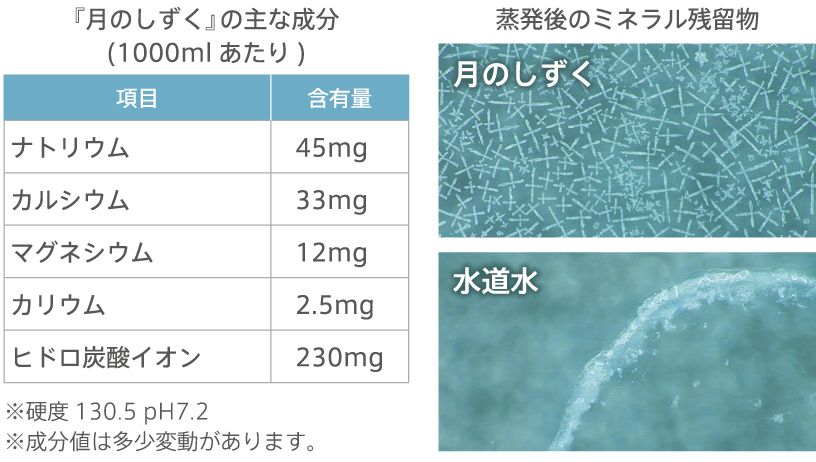 飲用には濃すぎる「銀水」を、まろやかな「金水」と黄金比率でブレンドすることで飲みやすくし、スムーズに吸収できるように調整したものが『月のしずく』です。