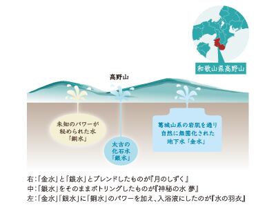 和歌山県高野山の麓、地下1,187メートルから湧き出す35億年前の太古の化石水と言われる温泉水(銀水)と岩肌を通って二菫ろ過された無歯の地下水(金水)をブレンドして生まれたミネラルウォーターです。『月のしずく』とは、弘法大師にゆかりの深い、高野山麓「神野々」の里に湧く地下水「金水」と「銀水」をバランスよくブレンドしたミネラルウォーターです。このお水がもたらす恵みは、私たちの想像をはるかに超えるものがあります。国際アクアフォトミクス学会の研究によって、科学的に明らかになりつつあるこの“生命を育む水・生きた水”を丁寧にボトリングしゆの里より直送お届け致します。