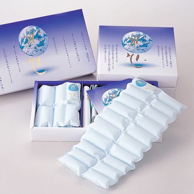 ゆの里に湧く「金水・銀水・銅水」の3種の水が持つエネルギーをバランス良く配合したお水のパットです。使い方はいろいろ。フィットするようにキルティング状にできていますので、身体の気になるところに当てたり、目や頭にのせて冷やしたりと、お好みで心地よいようにお使いください。